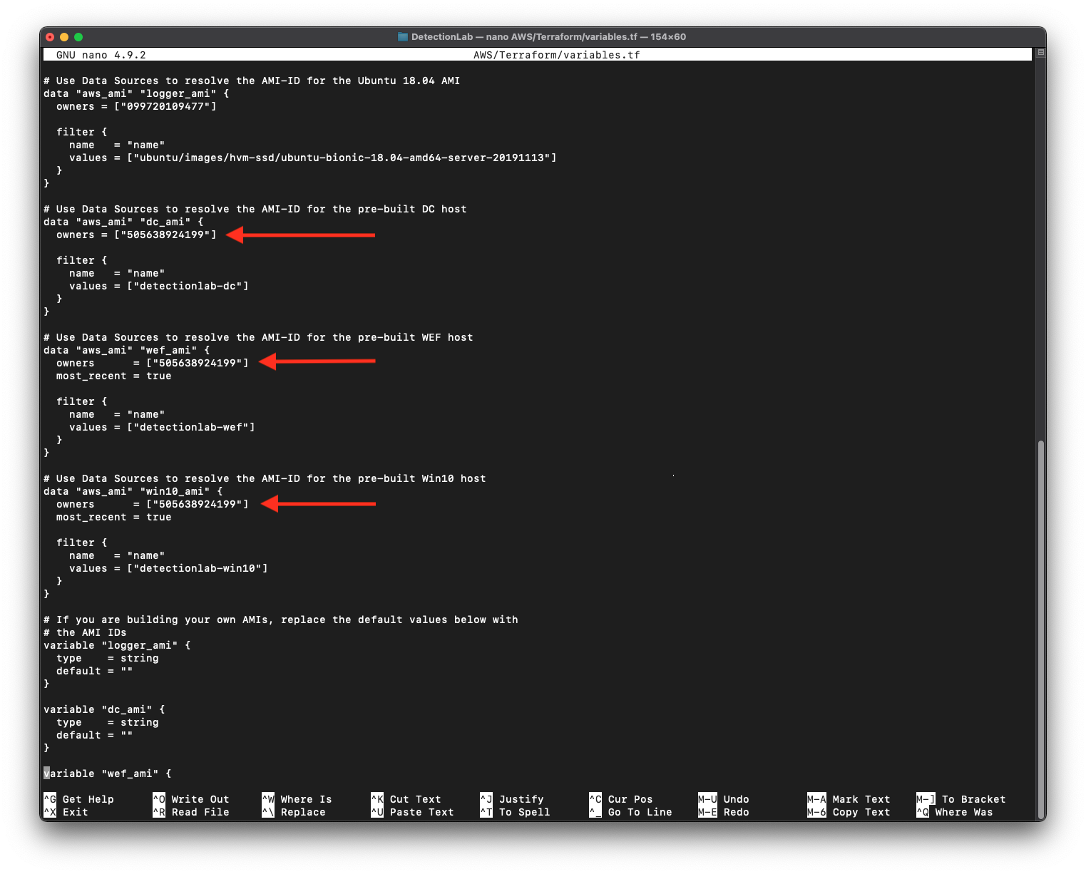 Terraform/variables.tfvars and change the dc_ami, wef_ami, and win10_ami default values from empty string (“”) to the AMI ID shown in your AWS console.owners value from 505638924199 to your own AWS account ID in variables.tf. Be sure not to change the owner for logger during this step.
