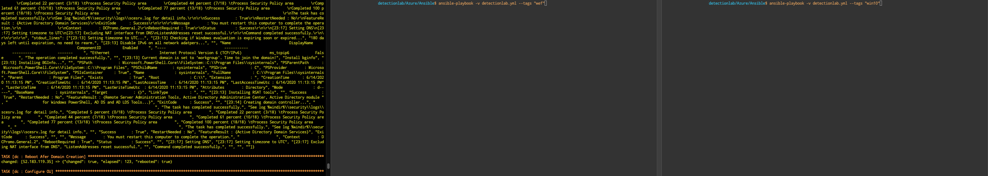 If you’d like to take the faster route, I recommend opening 3 terminal windows to DetectionLab/Azure/Ansible and following these steps: