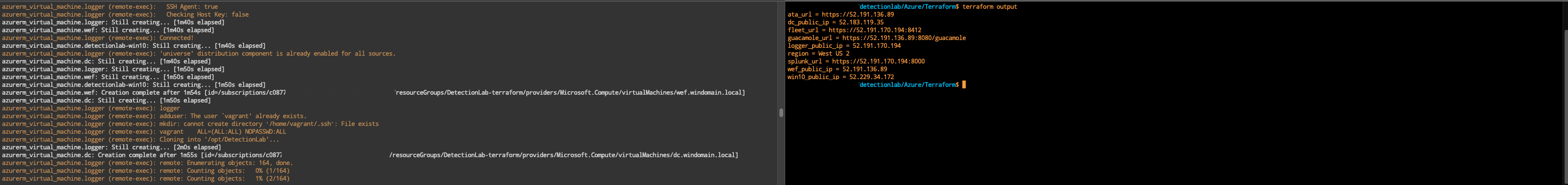 At this point in time, you should be able to open a new terminal window, navigate to DetectionLab/Azure/Terraform and run terraform output. You should see something like the following: